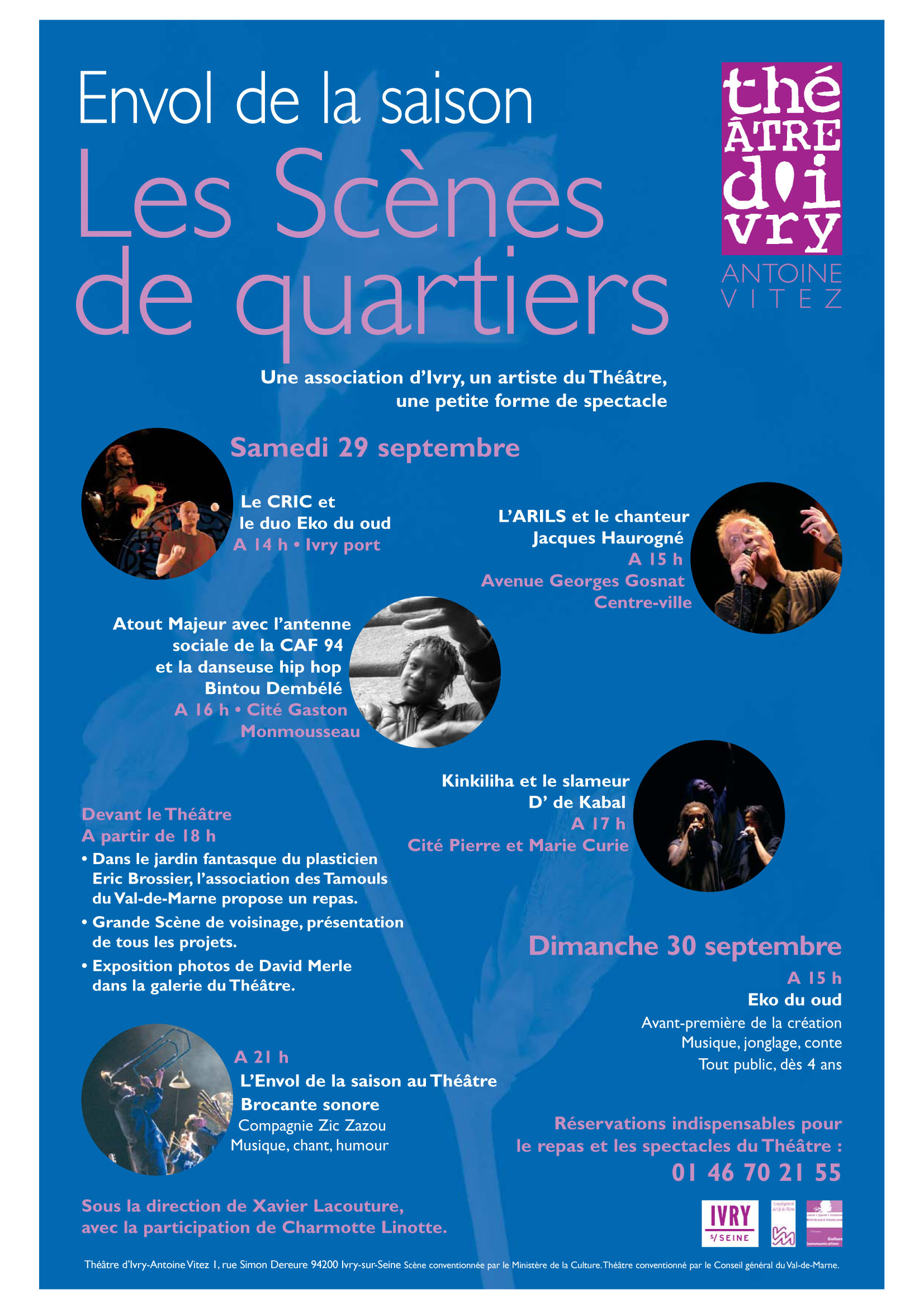 après un repas proposé par l’association des Tamouls du Val-de-Marne,la saison vous sera présentée et vous pourrez assister à partir de 21hdans la grande salle du théâtre à un spectacle de “La Brocante Sonore”