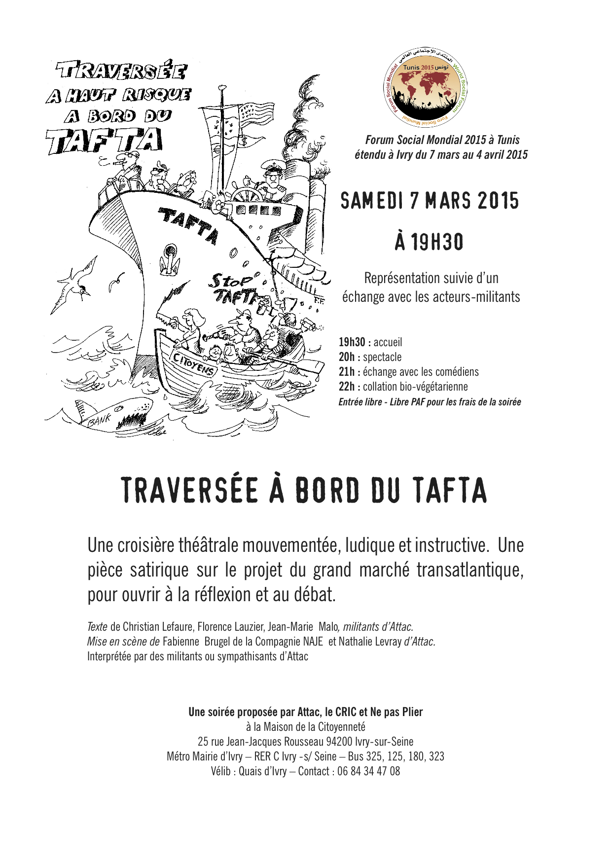 De la viande aux hormones aux OGM en passant par l’exploitation des gaz de schiste et la libéralisation du commerce des produits toxiques, la mise en place de ce traité risquerait fort d’être une catastrophe. D’après : http://www.agirpourlenvironnement.org/campagne/traite-transatlantique-tafta-non-merci/