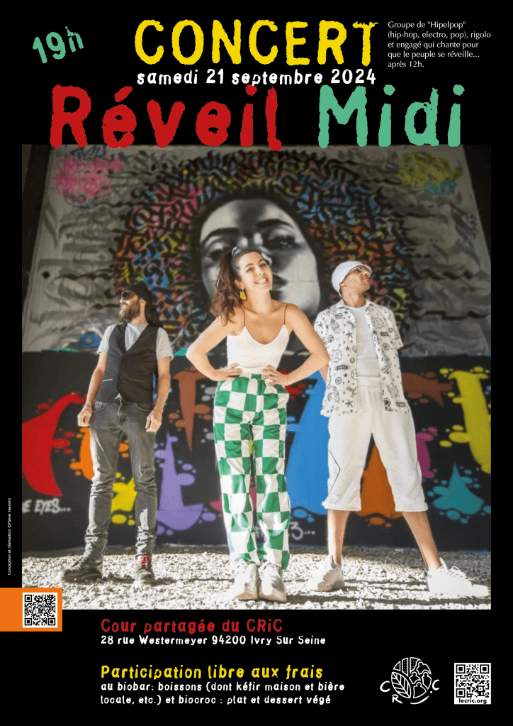 Le CRiC vous invite chaleureusement le samedi 21 soir septembre pour un concert en plein air (si le temps le permet, sinon à l’intérieur) avec le groupe ivryen Réveil Midi.