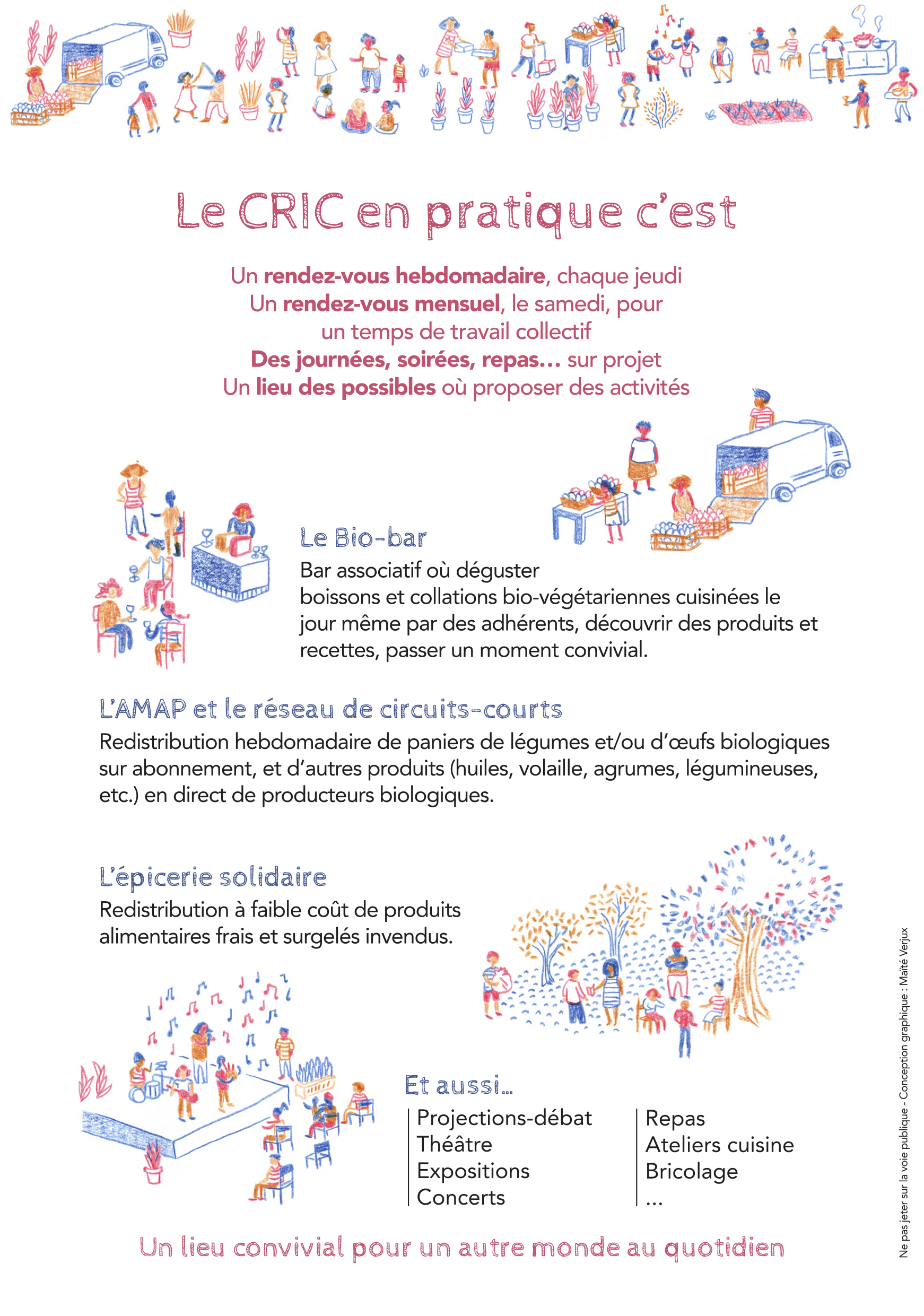 Lieu convivial de production et d’échange pour développer d’autres manières d’être et d’agir en société, qui recréent du lien social. Partenariats AMAP et circuits courts. Culture de Kéfir de fruits (grains à donner) et Kombucha, jeux, projections, concerts, discussions, et autres évènements ou activités organisées par les membres.